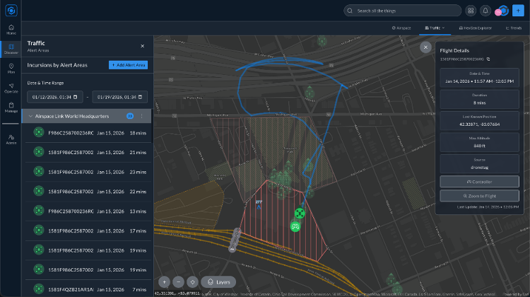 Airspace Link внедрила зоны оповещения на портале AirHub, предоставляя уведомления в режиме реального времени, когда беспилотные летательные аппараты вторгаются в заданное пользователями воздушное пространство.